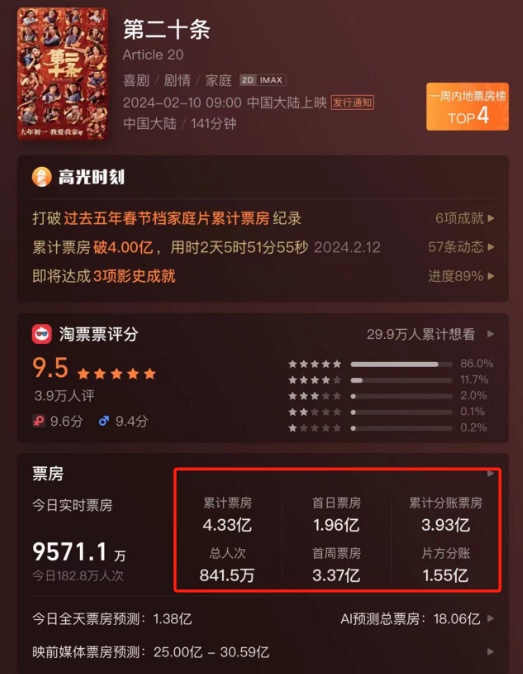 据灯塔专业版App,截至2月12日15时,《第二十条》累计票房4.33亿,观影总人次841.5万。