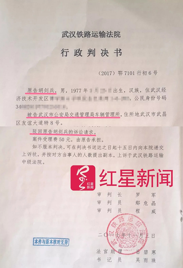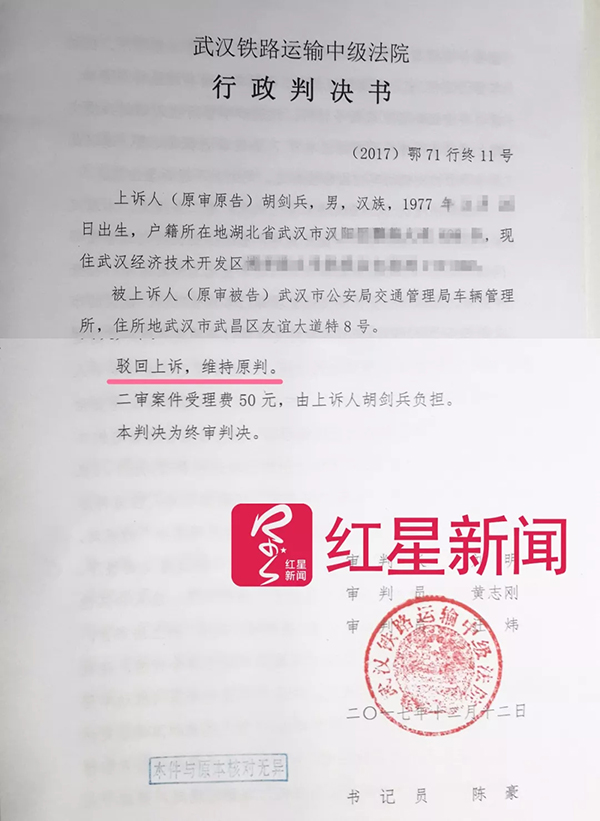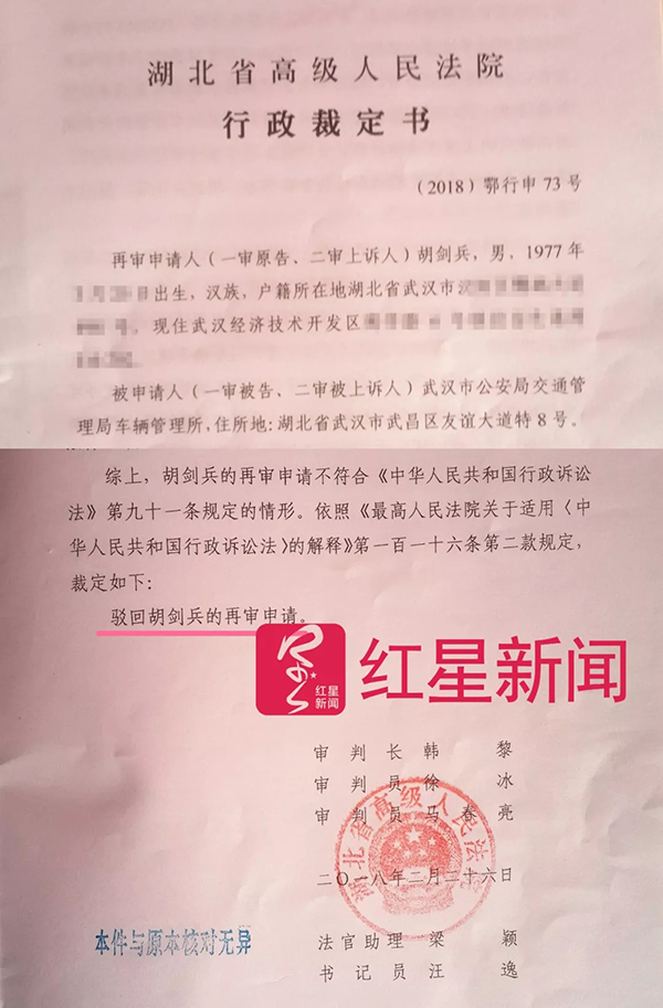 从2017年6月起,胡剑兵因不满“捆绑式年检”,将武汉市公安局交管局车管所告上法庭,但一审二审均被判败诉。他申请再审,到今年2月26日,湖北省高院做出裁定,他的再审诉求被驳回,3次均告失败。