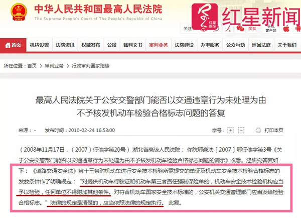 据了解,湖北省高院曾在2008年向最高法发出《关于公安交警部门能否以交通违法行为未处理为由不予核发机动车检验合格标志问题的请示》,最高法在答复中明确指出,《道路交通安全法》第十三条中“对提供机动车行驶证和机动车第三者责任强制保险单的,机动车安全技术检验机构应当予以检验,任何单位不得附加其他条件。对符合机动车国家安全技术标准的,公安机关交通管理部门应当发给检验合格标志。”法律的规定是清楚的,应当依照法律的规定执行。