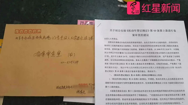 但这位武汉车主并没有放弃。今年3月30日,胡剑兵向全国人大常委会法工委法规备案审查室寄出了关于对公安部《机动车登记规定》第49条第2款进行备案审查的建议。