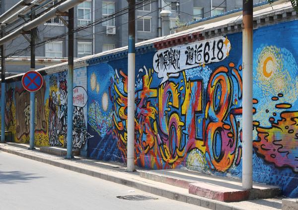 2017年6月16日,北京,京东联合摩拜单车,将“京东618购物节”的广告以墙体涂鸦形式制作,手绘在了798艺术区的大片墙体上。  视觉中国 图