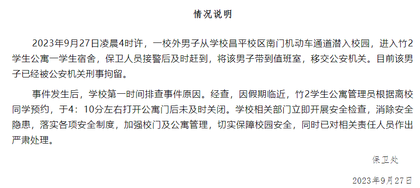 27日晚,中国政法大学保卫处发文称,当日凌晨4时许,一校外男子从学校昌平校区南门机动车通道潜入校园,进入竹2学生公寓一学生宿舍,保卫人员接警后及时赶到,将该男子带到值班室,移交公安机关。目前该男子已经被公安机关刑事拘留。