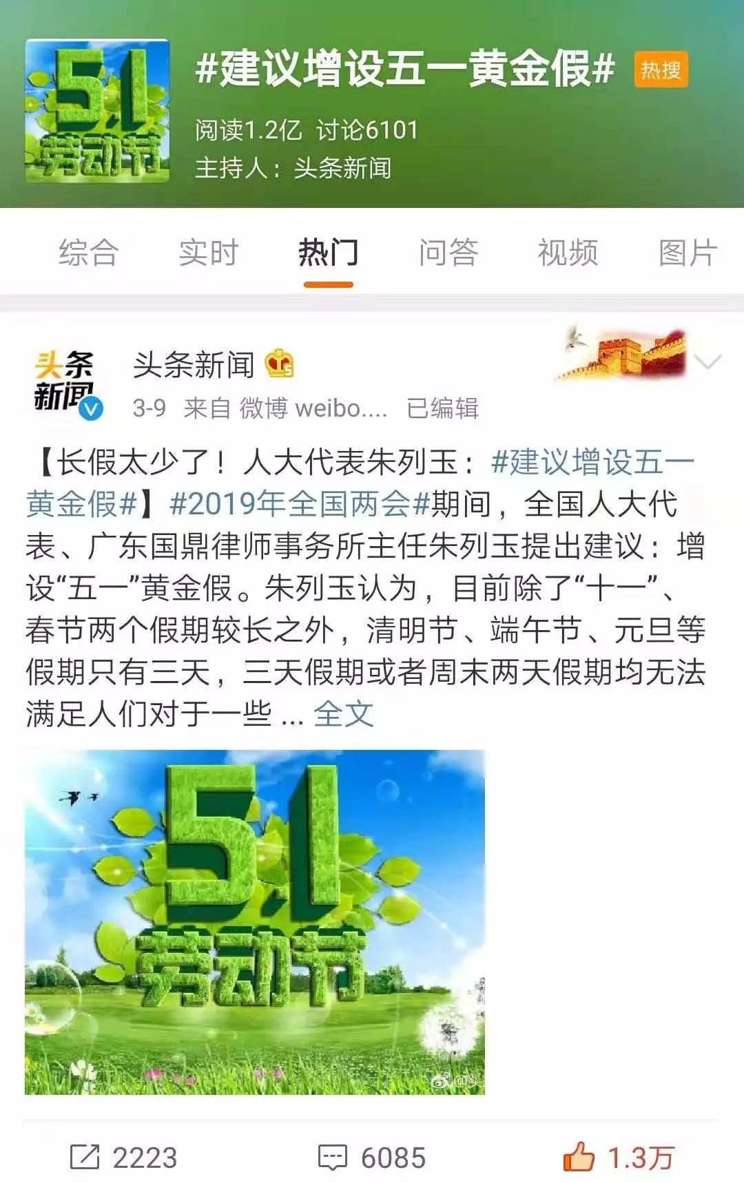 两会期间,全国人大代表、广东国鼎律师事务所主任朱列玉建议:增设五一黄金假,满足大众出行需求,完善假期结构。据悉,该建议被媒体广泛报道,微博话题参与阅读量已达1.2亿,引起网友强烈关注!