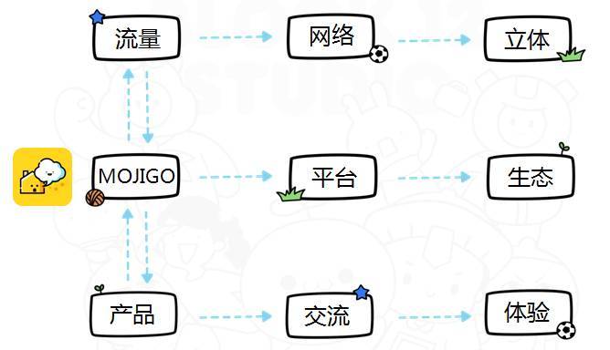 下图是MOJIGO,我们想把它做成一个形象化IP孵化平台,希望让不同人能在这里找到自己定位,让与形象化相关的生态能够建立起来。从产品来说更重要的是交流,如何做连接性的产品,最终让大家有更好的体验与认知。从这来讲,我们公司的运作是一手抓流量,一手抓产品。