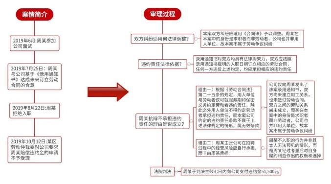 法院经审理查明:周某于2019年6月应聘勃林某某公司市场经理一职,勃林某某公司于同年7月25日向周某发出录用通知书,载明了周某的入职岗位、工资福利、工作地点等内容,并约定若周某拒绝签订劳动合同,则应当赔偿违约金51,500元。当日,周某在录用通知书上签名并以扫描件形式发还勃林某某公司。同年8月22日,周某明确拒绝入职勃林某某公司。