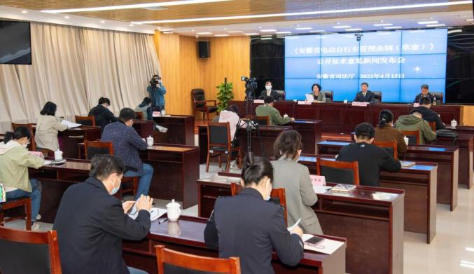4月15日上午,安徽省司法厅召开《安徽省电动自行车管理条例(草案)》新闻发布会。发布会由省司法厅党委委员、副厅长黄冰霓主持,省司法厅副厅长、一级巡视员夏月星介绍相关情况,相关负责同志回答记者提问。以下是发布会实录: