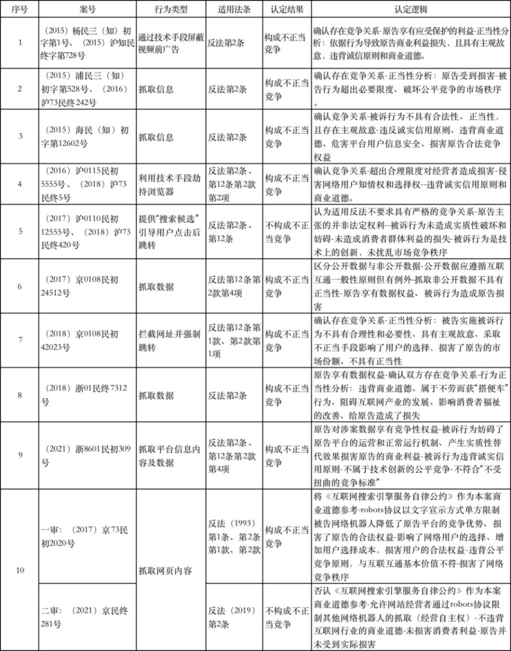 互联网行业是建立在庞大的流量之上的经济行为,根据著名的梅特卡夫定律,网络的价值等于网络节点数的平方,网络的价值与联网的用户数的平方成正比。数据也被称为互联网时代的“石油”,因此,数据和流量成为平台竞相争取的资源。互联网平台采取的如链接屏蔽、插入链接、强制跳转、恶意不兼容、数据的抓取等各类行为,其最终的目的是为了获取流量或数据。因此,本文对案件的分类是以互联网不正当竞争行为造成的法律后果为标准进行的划分。本文在中国裁判文书网,通过对“不正当竞争”“流量”“数据”“抓取”“爬虫协议”“屏蔽”等关键词检索了裁判日期在2013年1月1日至2023年6月1日的民事判决书,通过对内容的甄别和匹配后整理出10件有效案例(见表1)。