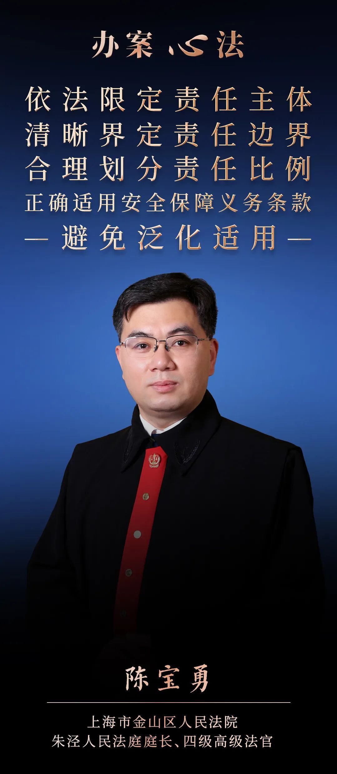 本期“办案心法”栏目“上海法院审判业务骨干”特别专题,邀请上海法院审判业务骨干,上海市金山区人民法院朱泾人民法庭庭长、四级高级法官——陈宝勇为我们讲解如何正确适用安全保障义务条款,合理划分责任比例。