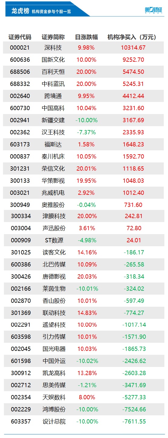 盘后数据显示,5月11日龙虎榜中,共32只个股出现了机构的身影,有17只股票呈现机构净买入,15只股票呈现机构净卖出。当天机构净买入前三的股票分别是深科技、国新文化、百利天恒。当天机构净卖出前三的股票分别是设计总院、鸿博股份、天娱数科。