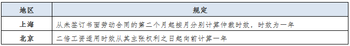 1.从用工满1个月后的每一个工资支付周期期满起算一年仲裁时效,例如:上海、北京