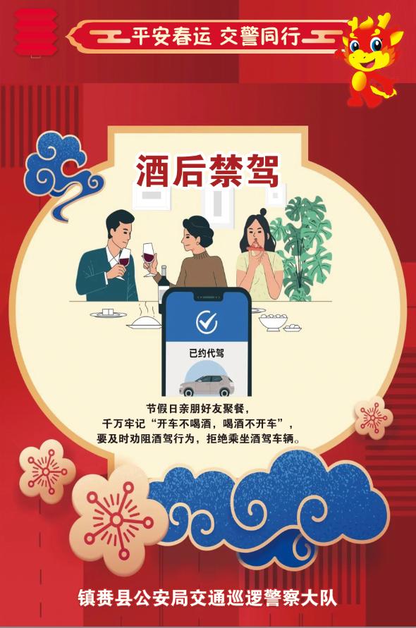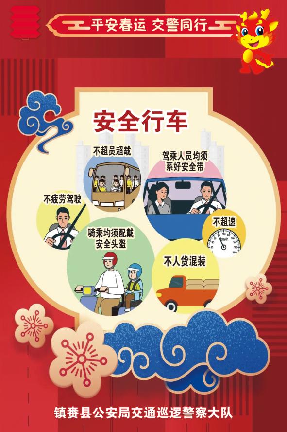 值此新春佳节即将来临之际,全县迎来一年中道路交通繁忙、交通事故易发多发的春运时节。交通安全,关系到千家万户的幸福安康和社会的和谐稳定,承载着公安交管部门保护人民群众生命财产安全的初心使命和不懈追求,离不开你们的理解支持和积极配合。在此,我们真诚地期待您将以下规则融入您的生活: