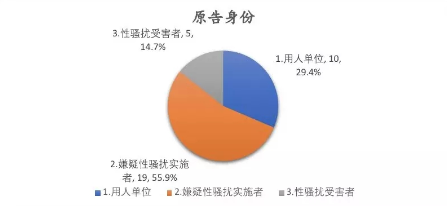 其中,以原告身份来看,用人单位占10例、嫌疑性骚扰实施者占19例、性骚扰受害者(含受害者亲友)占5例。以被告身份来看,用人单位占20例、嫌疑性骚扰实施者占9例、性骚扰受害者(含受害者亲友)占5例。