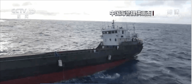 中国海警局直属第四局执法员:3米多的浪,整个船摇摆相当厉害,而且那个目标船也很高,如果放小艇,真的放下去的话,我们也爬不上那个目标船,所以说根据情况,我们也是请示上级,上级同意直接用这个母船进行靠泊。