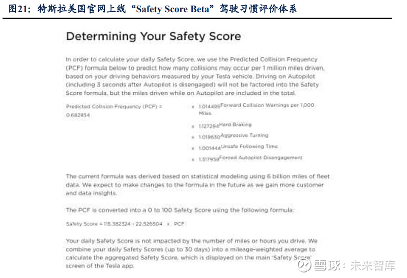 自营车险的保费计算规则与传统险企不同,主要根据驾驶员的实时驾驶习惯和风险 等级调整保费的高低,一人一价,一车一价。2021 年 10 月 15 日,特斯拉美国官网正 式上线了名为“实时驾驶行为”的保险产品,目前只有德克萨斯州的特斯拉车型才可以 选择购买。同时,特斯拉推出“Safety Score Beta”驾驶习惯评价体系,通过车辆和 Autopilot 自动驾驶辅助系统传感器传输的数据对驾驶行为进行评估,并估算其驾驶导致未来事故的可能性。该系统基于五个安全系数指标进行衡量:1.每 1000 英里的前向碰撞警告次数 (Forward Collision Warnings per 1,000 Miles),即无人为干预的情况下特斯拉协助驾驶 者主动刹车的次数;2.急刹车频率(Hard Braking),即每秒减速超过 10.76km/h 的大力 刹车占总刹车次数的比值;3.急转弯频率(Aggressive Turning),即车身左右横向加速度 大于 0.4g 的剧烈转向占总转向次数的比例;4.跟车过近频率(Unsafe Following Time), 即反应时长小于 1s 的跟车时长占总跟车时间的比例(该指标衡量仅在时速超过 50mph 时进行);5.Autopilot 强退次数(Forced Autopilot Disengagement),即自动驾驶开启时驾 驶者双手脱离方向盘导致 Autopilot 系统强制退出的次数。对应传感器测量的数据传输 至计算系统,根据公式计算出预测碰撞频率(PCF),然后转换为 0-100 的安全评分;日 常安全评分在每次驾驶后自动刷新,每 30 天合并为月度里程加权平均安全分,为下月 保费计算提供定价依据。
