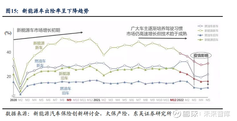 驾驶者适应过程增加潜在风险,广大车主逐渐培养驾驶习惯,预计出险率呈下降趋 势。由于险企新能源车险业务中新车占比较高,其驾驶者相对缺乏新能源车驾驶经验, 在适应驾驶习惯的过程中增加潜在风险,进而导致出险率高于传统燃油车。据中再产险 统计,新能源车市场增长初期,新能源新车出险率维持在超过 40%的高位,超出燃油车 新车近 20%,新能源旧车出险率亦显著高于燃油车,且仍处于上升阶段。车险综改前夕, 新能源新车出险率已接近 50%,过高的出险率导致保险公司对于新能源车业务十分谨慎, 承保意愿较低。2021 年开始,随着新能源车主对驾驶习惯的逐渐适应、驾驶经验的积累 和三电系统技术的逐渐成熟,出险率开始出现下降趋势;在新能源车专属产品推出后, 下降趋势更加明显。2022 年前五个月,受到疫情影响出行时间减少,汽车整体出险率均 降低,其中新能源车出险率降幅显著。出险率的下降直接作用于赔付率,或将有效减小 保险公司专属产品赔付压力。我们预计随着未来新能源新车渗透率逐步平稳,赔付率有 望逐步向传统燃油车靠拢。