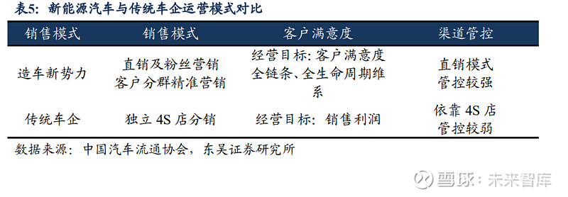 新能源“造车新势力”打造差异化运营模式。新能源汽车营销布局由点到面,营销 方式持续迭代,聚焦场景营销、触点营销、用户营销三大方面。与传统车企相比,以特 斯拉和“蔚小理”为代表的造车新势力在商业模式上有以下几点不同:1.销售模式,造 车新势力多采用直销和粉丝营销的模式进行客户分群、精准营销;而传统车企不存在客 群精准营销,系独立 4S 店分销渠道机制所致。2.客户满意度,有互联网基因和背景的 造车新势力将首要经营目标定为客户满意度,认为售车后的客户经营是全生命周期经营 的关键;而传统车企以销售利润为导向,对于客户全链条的运营和维系相对薄弱。3.渠 道管控,造车新势力采用直销模式,对销售环节进行垂直管理,管控能力较强;传统车 企依靠 4S 店,销售渠道管控较弱。科技背景及信息优势加持下,造车新势力不甘于只 做生产企业,是直营模式兴起的主要原因,转型成为全链条出行服务商成为大趋势。车 商除了传统销售,还拓展了保养、理赔、维修、汽车金融等后市场业务,车企逐渐渗透 整个价值链条,成为消费者用车综合服务的主要提供方。