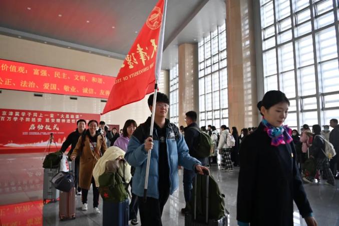 2023年12月4日,京津冀学子同上一堂“大思政课”暨“百万学子回延安 延安精神进校园”活动启动仪式在天津火车站举行。来自北京师范大学、南开大学、河北工业大学等13所高校的约300名师生,赴延安开展为期一周的红色研学实践活动。图为启动仪式当日,天津理工大学师生准备进站前往延安。新华社记者 李然/摄