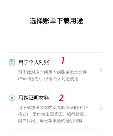 第五步:在账单下载界面,有“用于个人对账”和“用做证明材料”两个功能选项,分别对应账单不同的用途。其中“用于个人对账”的账单是 Excel 表格格式,“用做证明材料”的账单是 PDF 格式。