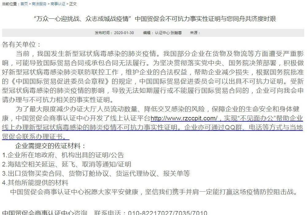 如果涉及第三方出具有关不可抗力的证明,可以向中国国际贸易促进委员会申请出具《不可抗力证明》(如下图所示,主要适用国际贸易类型合同)。