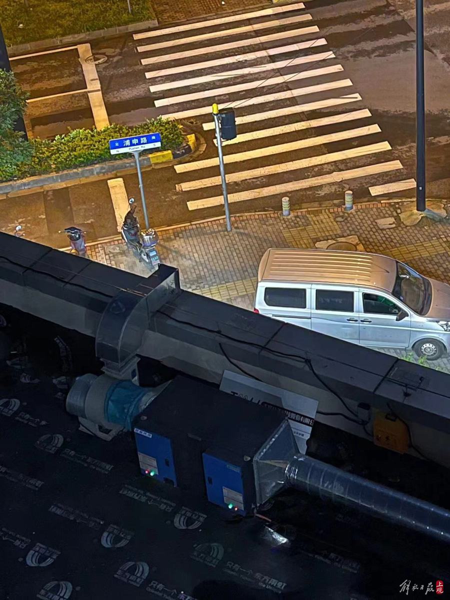 油烟管道的最顶端出口位于裙楼楼顶,仔细观察可见一缕缕浅灰色的烟雾从管道口排到空气中。