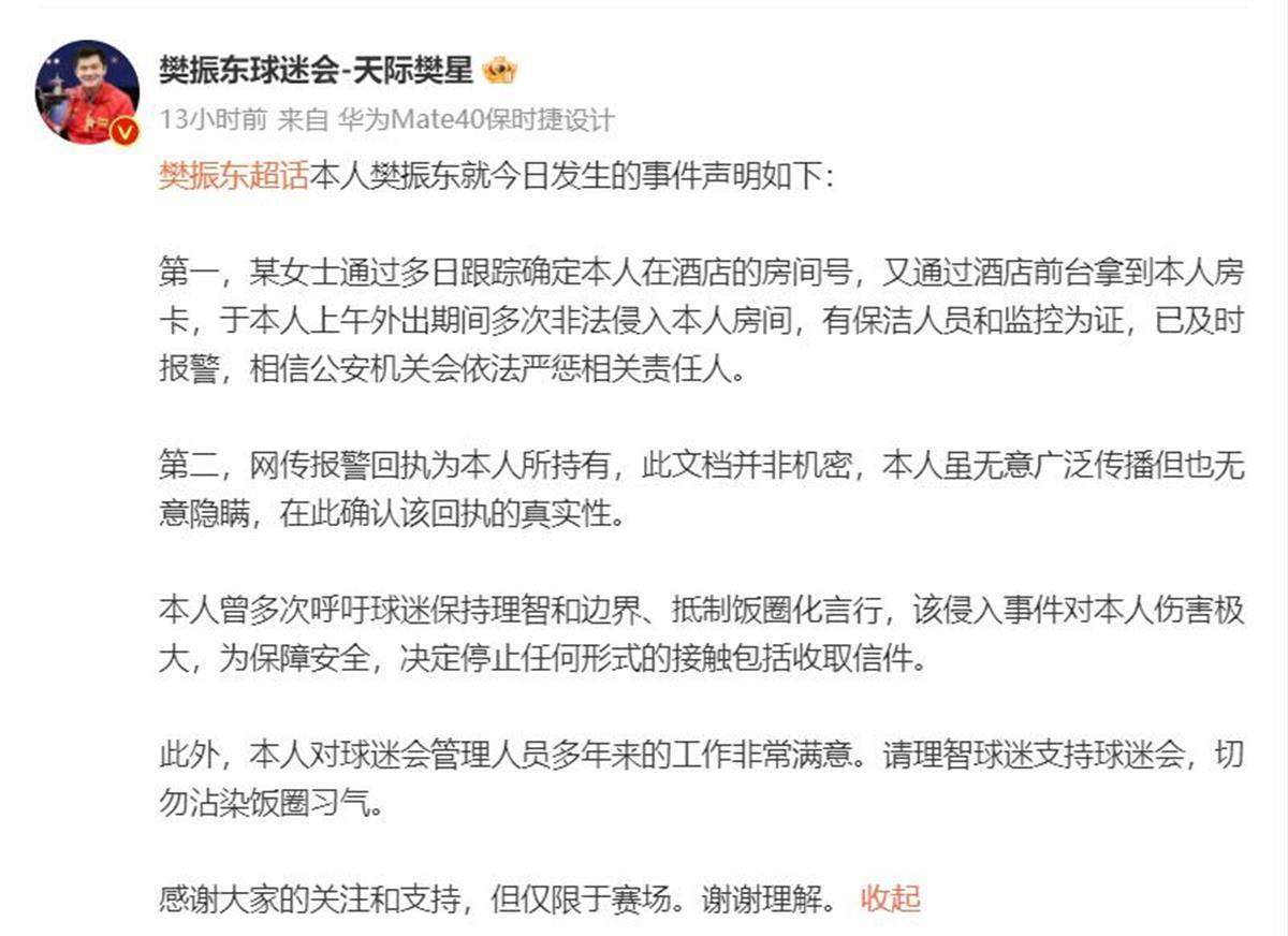 4月6日晚,樊振东通过其球迷会的平台账号发文声明称,某女士通过多日跟踪确定他在酒店的房间号,又通过酒店前台拿到他房间房卡,在他上午外出期间多次非法侵入其房间,有保洁人员和监控为证,已及时报警处理。