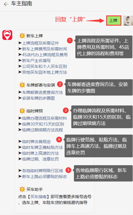小编提醒:在微信公众号【车主指南】回复【上牌】,即可获取上牌流程及所需证件、上牌费用及所需时间、车牌邮寄进度查询方法、安装车牌步骤等;查看办理临牌流程及所需材料、临牌30天和15天的区别、临牌行驶范围、粘贴方法;获知各地临牌限行区域、新车上路必须张贴的标志等。