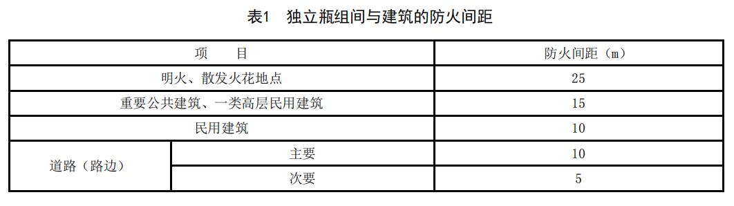 5.3 当采用强制气化方式供气时,瓶组气化间应为高度不低于 2.2m 的独立房间,其建筑要求应符合本标准 5.2 条的相关要求,且与建筑的防火间距不应小于表 1 的规定: