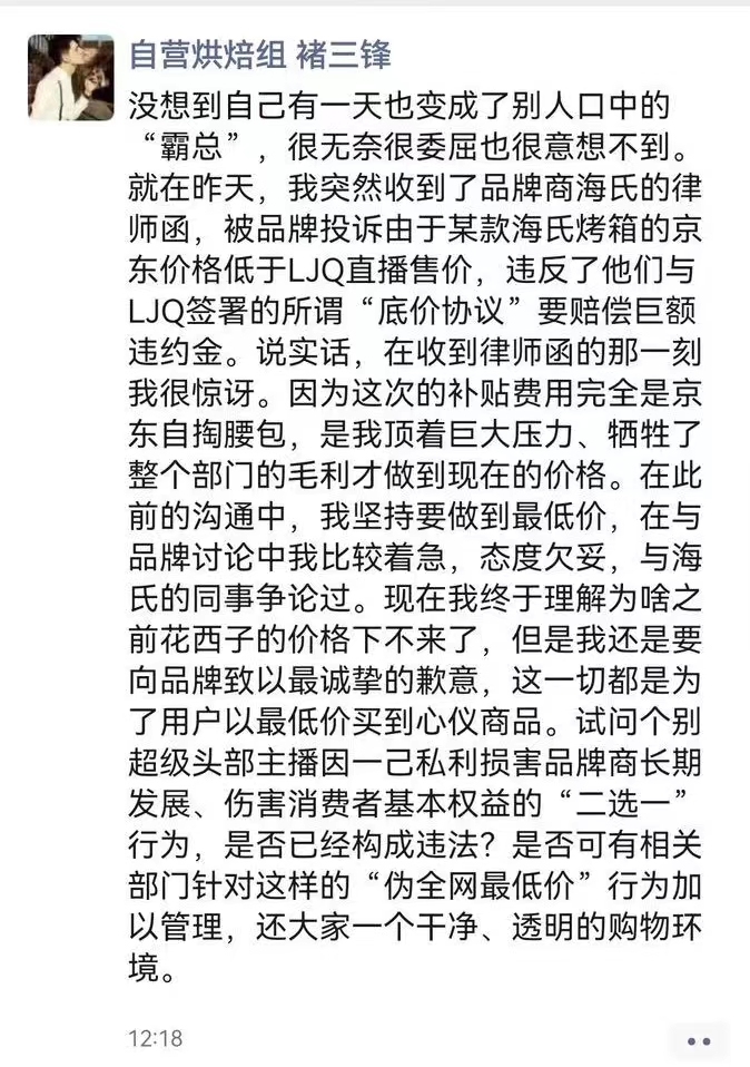 该京东采销人员在朋友圈回应中直接指出海氏需要赔偿的“其他客户”为李佳琦直播间。品牌商投诉主要因为双11活动中某款海氏烤箱的京东价格低于李佳琦直播售价,违反了海氏与李佳琦签署的“底价协议”。