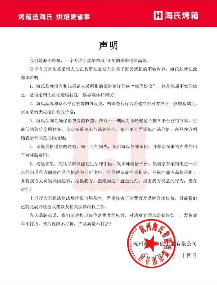 海氏官微随后也发声明否认底价协议的存在,称京东采销人员的朋友圈信息不实。官方声明继续将此次矛盾直指京东,称对方未与品牌商协商就违约擅自修改价格。海氏发给京东的律师函细节显示,按照双方此前签署的《产品购销协议》规定,产品定价权归品牌商海氏所有。