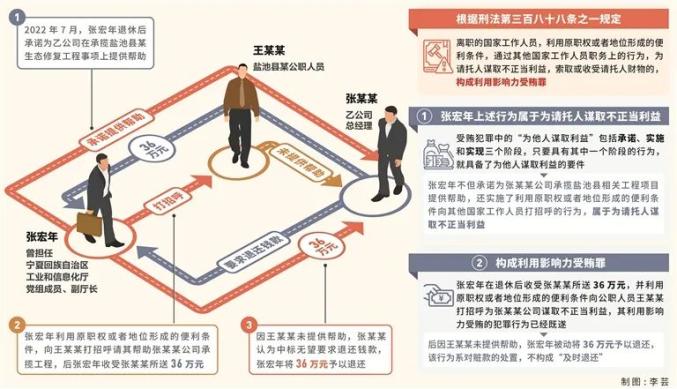 利用影响力受贿罪。2021年5月至2023年11月,张宏年退休后接受多个单位和个人请托,利用原职权和地位形成的便利条件,通过向其他国家工作人员打招呼的方式,为上述单位和个人在申报项目补助资金、职务晋升等方面谋取不正当利益,先后收受上述单位、个人所送钱款共计93万元。