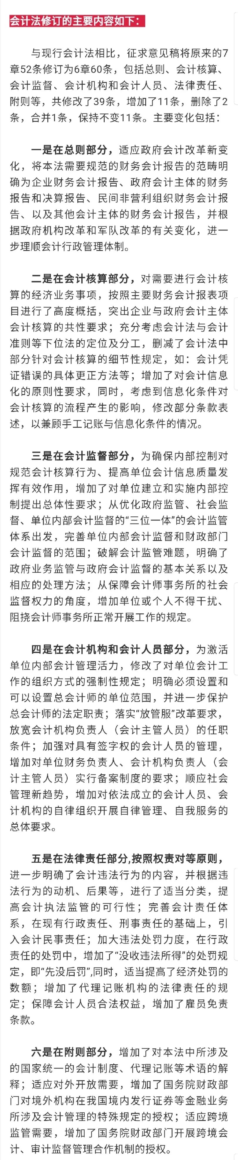为贯彻落实全面依法治国要求,切实提高会计信息质量,促进会计行业更好地服务经济社会发展,财政部对《中华人民共和国会计法》进行修订,形成了《中华人民共和国会计法修订草案(征求意见稿)》,现向社会公开征求意见。公众可在2019年11月20日前,通过以下途径和方式提出意见: