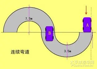 从弯道一端向前行驶,减速换挡,低速低挡从另一端驶出。中间不停车,车轮不接触车道边线,方向可以自由使用。