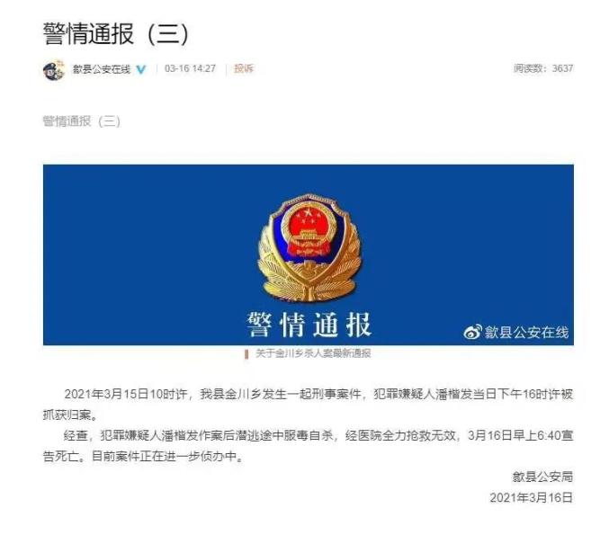47.安徽一乡党委书记独自下乡途中遇害,被认定为因公牺牲,犯罪嫌疑人畏罪服毒身亡。(安徽日报)