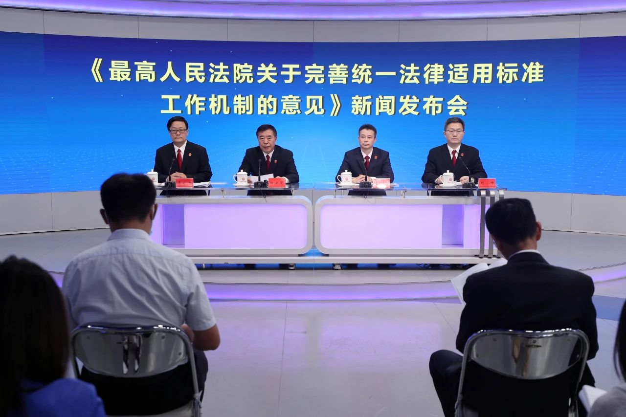 9月23日,最高人民法院举办新闻发布会,发布《最高人民法院关于完善统一法律适用标准工作机制的意见》(以下简称《意见》)。最高人民法院副院长杨万明、最高人民法院应用法学研究所所长曹士兵、最高人民法院司法改革领导小组办公室副主任刘峥出席发布会并介绍相关情况,最高人民法院新闻发言人李广宇主持发布会。