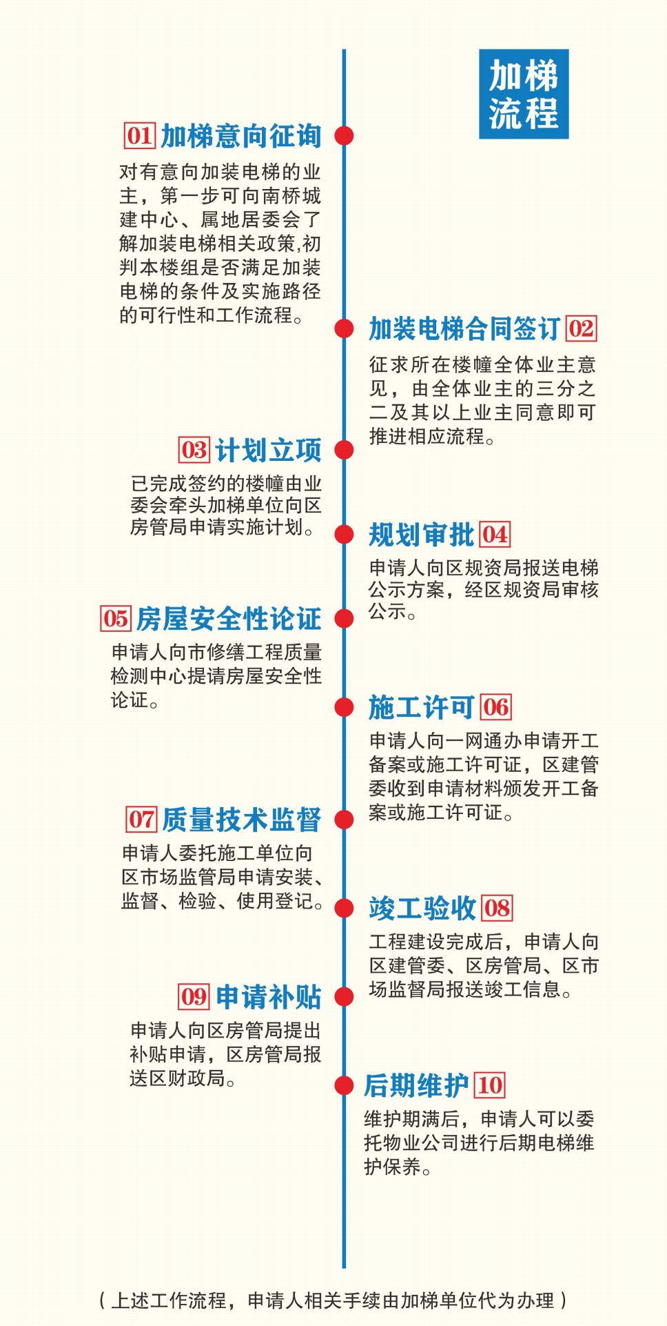 业主形成书面协议后,加梯单位委托设计单位进行现场勘察,后向房屋、规划、建设、质监等行政管理部门申请。