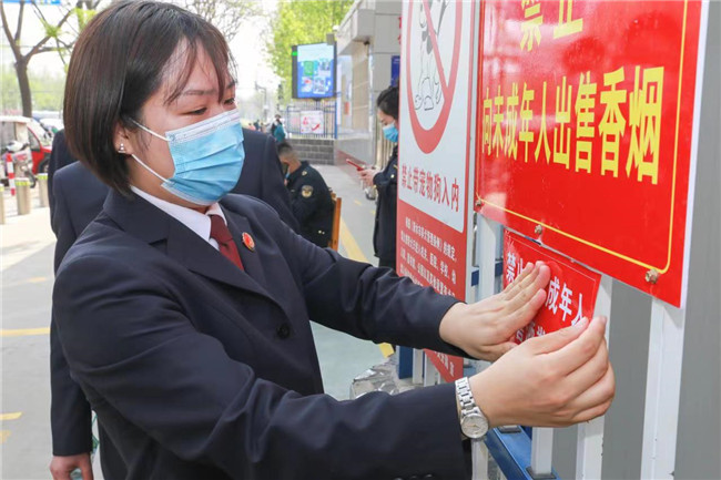 检察干警与市场监管人员一起张贴禁止向未成年人售酒的提示。