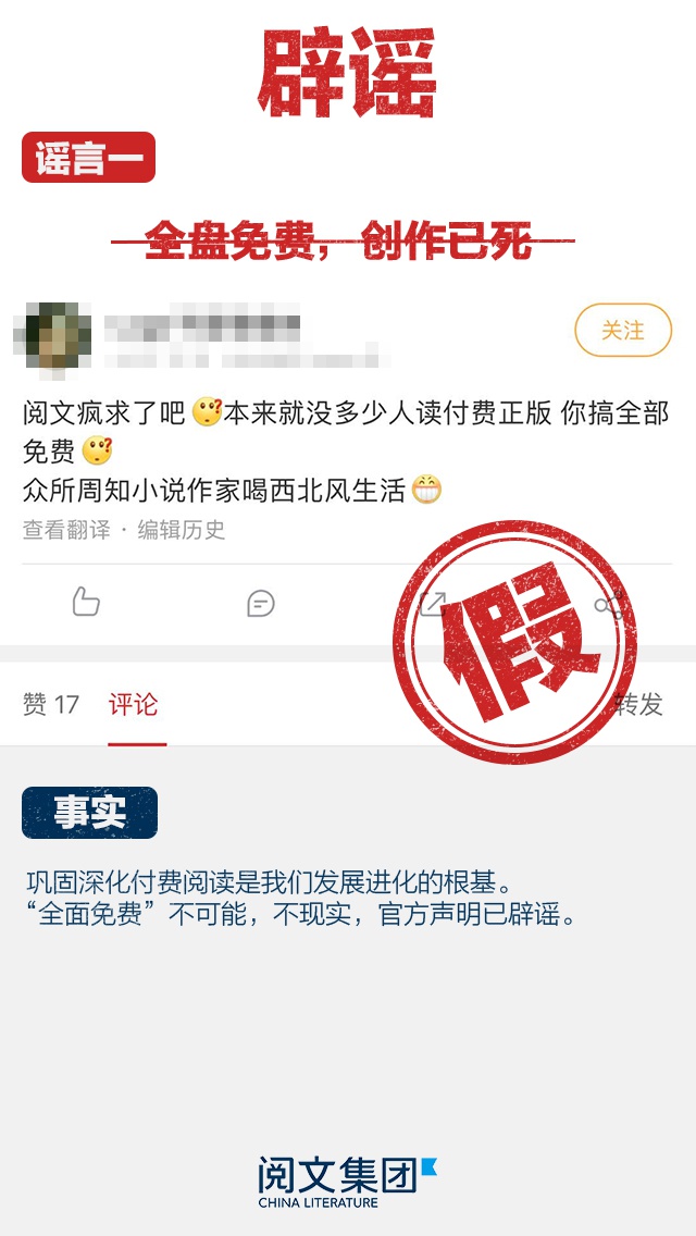 程武则在个人朋友圈中发声称,原本计划用起码三个月的时间充分融入团队、与作家们沟通以及和行业合作伙伴们交流。但这两天谣言突然发端,先后炮制了“阅文要取消付费阅读实行全免费的策略,把去年并行使用并在本月中全面上线的作家协议中的部分条款强行冠以新管理团队新政”的谣言。他称,合同的问题,阅文会直面;为作家带来更好的回报,是大家共同的目标;而那些谣言和诋毁,也会让阅文更清醒坚定地做好自己。