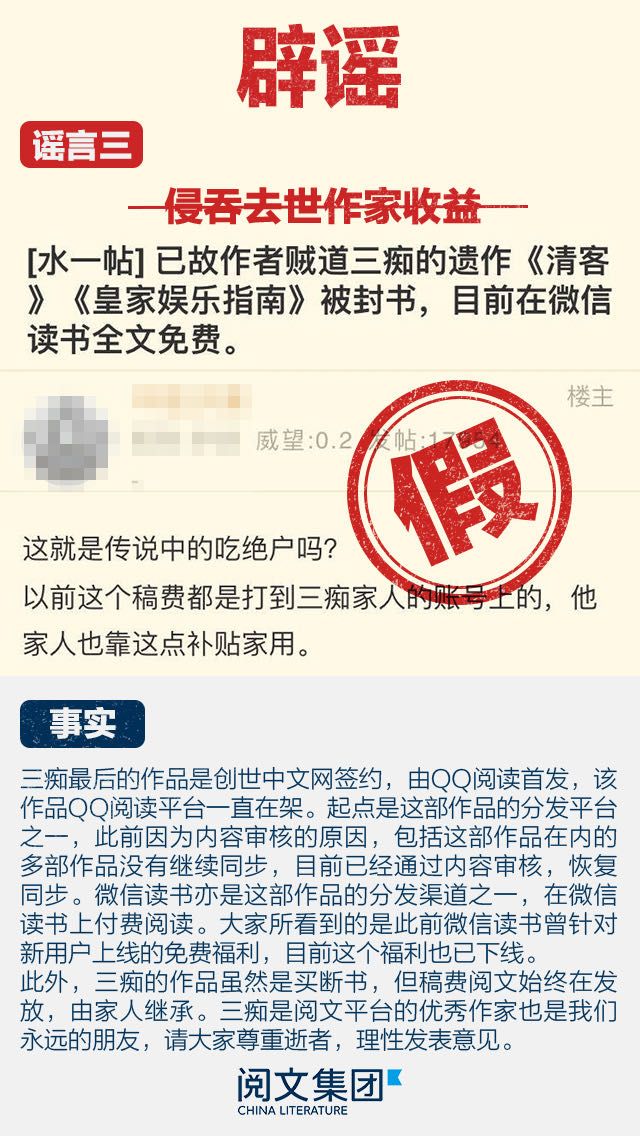 而被热议的侵吞去世作家“贼道三痴”收益的说法,阅文称,三痴最后的作品是创世中文网签约,由QQ阅读首发,该作品QQ阅读平台一直在架。起点是这部作品的分发平台之一,此前因为内容审核的原因,包括这部作品在内的多部作品没有继续同步,目前已经通过内容审核,恢复同步。此外,三痴的作品虽然是买断书,但稿费阅文始终在发放,由家人继承。三痴是阅文平台的优秀作家也是我们永远的朋友,请大家尊重逝者,理性发表意见。