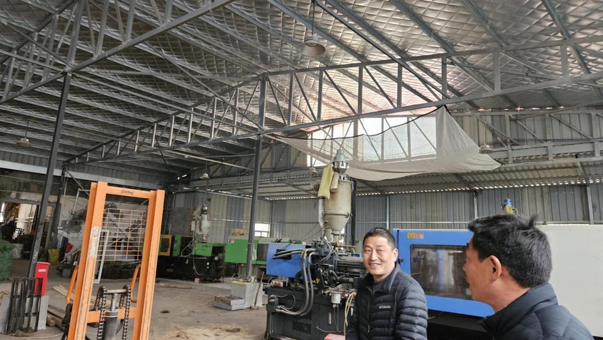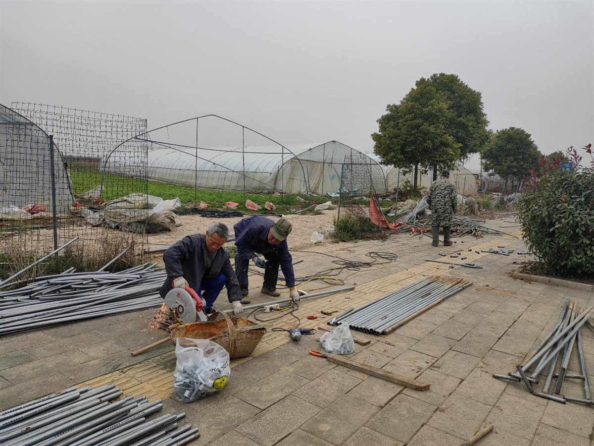 在连柏采摘园入口,机器切割火花四射,钢材在地面整齐排列。“我们听到村里喇叭在播报天气情况,立马就着手加固大棚了”,在大棚入口处,三位工人正在帮忙切割钢管,全力在19日白天把修复好的大棚加固加牢,抵抗冰雪灾害。