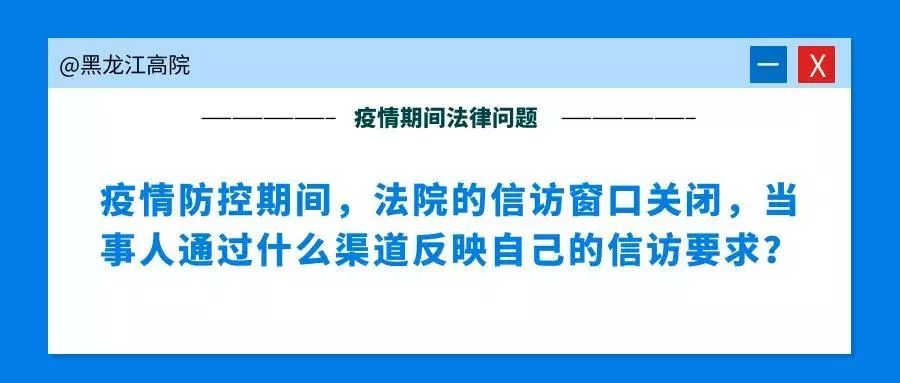 疫情防控期间,当事人反映信访诉求的,有网络、电话、邮寄三种方式。第一种渠道:通过中国法院网()“给大法官留言”“院长信箱”或黑龙江法院网()“民意直通车”反映信访问题。第二种渠道:拨打12368信访投诉语音服务热线反映问题。第三种渠道:邮寄信件至各级法院申诉信访部门。对于通过上述方式反映问题的,法院将及时办理回复,认真解决问题,做好跟踪问效,争取群众满意,切实做到事事有着落,件件有回音。
