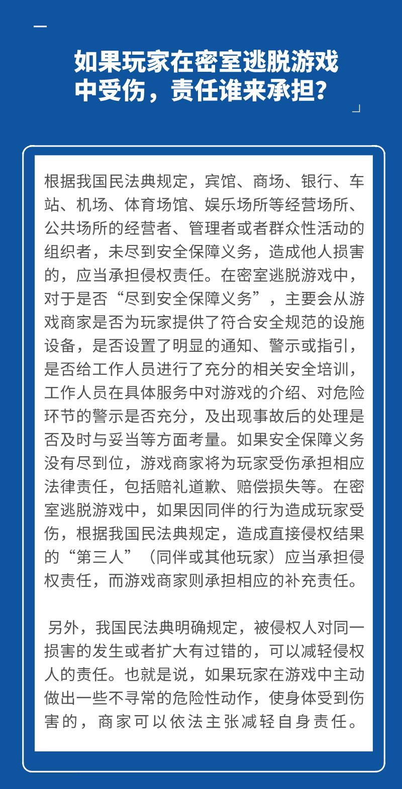 在选择体验馆和游戏主题时,不要盲目跟风,务必选择资质齐全、安全提示详细的正规商家,在看清相关介绍、安全提示,查看店家的道具设施设置情况、消防设施、疏散路线、求救方式等,充分评估综合状况后参加游戏。同时,在游戏中也不可实施可能损害他人的行为。