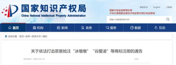 国家知识产权局昨天(14日)发布通告,依法打击恶意抢注“冰墩墩”“谷爱凌”等商标注册。国家知识产权局依据《奥林匹克标志保护条例》《商标法》第十条第一款第(八)项等规定,对第41128524号“冰墩墩”、第62453532号“谷爱凌”等429件商标注册申请予以驳回;依据《商标法》第四十四条第一款规定,对已注册的第41126916号“雪墩墩”、第38770198号 “谷爱凌”等43件商标依职权主动宣告无效。