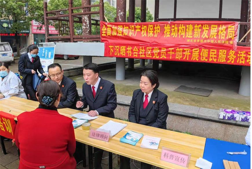 4月25日,孝感中院民三庭赴孝感市孝南区晒书台社区开展了主题为“全面加强知识产权保护 推动构建新发展格局”的知识产权宣传活动,提高人民群众对于知识产权的重视程度,营造良好的创新文化氛围。活动现场设立了法律咨询宣传点,悬挂了知识产权宣传标语,通过发放知识产权宣传折页、现场普及讲解知识产权相关知识、典型案例等方式,引导人民群众认识了解全国知识产权宣传周活动,理解知识产权保护范围及相关法律制度。
