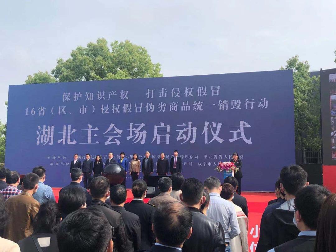 4月23日,“保护知识产权,打击侵权假冒” 16省(区、市)侵权假冒伪劣商品统一销毁行动湖北主会场启动仪式在咸宁举行。