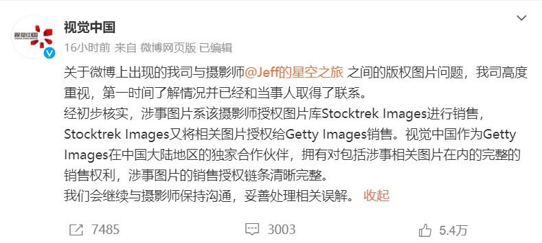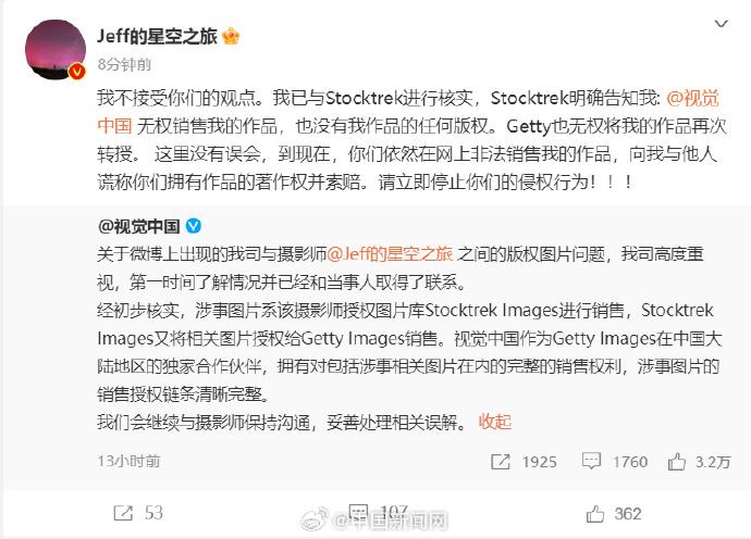 8月15日,知名摄影师戴建峰发文称,他接到视觉中国的电话,对方称自己拍摄的作品对视觉中国的173张照片造成侵权,需要赔偿8万元。8月15日晚,视觉中国回应称:涉事图片的销售授权链条清晰完整,会继续与摄影师保持沟通,妥善处理相关误解。