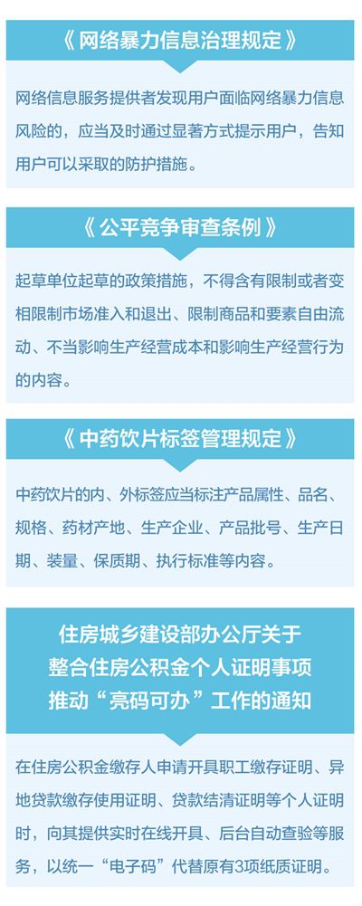 編者按:規范對網絡暴力信息和賬號的處置,強化用戶權益保護﹔明確公平競爭審查標准,著力打破地區封鎖和行業壟斷﹔全面實行住房公積金個人証明事項“亮碼可辦”﹔在我國境內生產、經營的中藥飲片,應標注產品規格、藥材產地、生產企業等信息……8月1日起,《網絡暴力信息治理規定》《公平競爭審查條例》《中藥飲片標簽管理規定》等一批法律法規施行,聚焦群眾關切,以法治力量推動經濟社會高質量發展。