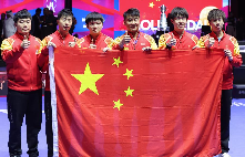 2月25日,中国队教练王皓(右三)、选手梁靖崑(左一)、马龙(左二)、樊振东(左三)、王楚钦(右二)、林高远夺冠后庆祝。当日,在韩国釜山进行的2024年国际乒联釜山世界乒乓球团体锦标赛男子团体决赛中,中国队3比0战胜法国队,夺得冠军。