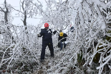 2月26日,在桂林市全州县东山瑶族乡,抢修队员利用无人机观察线路融冰情况。连日来,受冷空气影响,广西桂北高寒山区出现低温雨雪冰冻天气,导致电力线路覆冰,南方电网广西电网公司启动低温雨雪冰冻灾害Ⅲ级应急响应,及时组织电力抢修队伍,开展防冰抗冰应急处置工作,保障电网安全稳定运行和电力可靠供应。