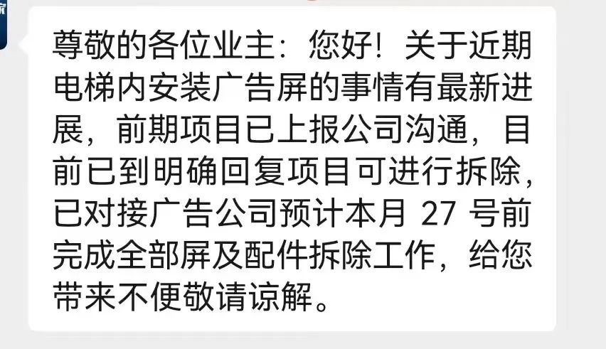 该工作人员还告诉记者,因为业主投诉很多,他们已准备进行拆除,目前工单已经发出。8月16日晚记者发稿前,胡先生告诉记者该事件有了最新进展,物业告诉业主目前已(收)到明确回复项目可进行拆除,已对接广告公司预计本月27号前完成全部屏及配件拆除工作。