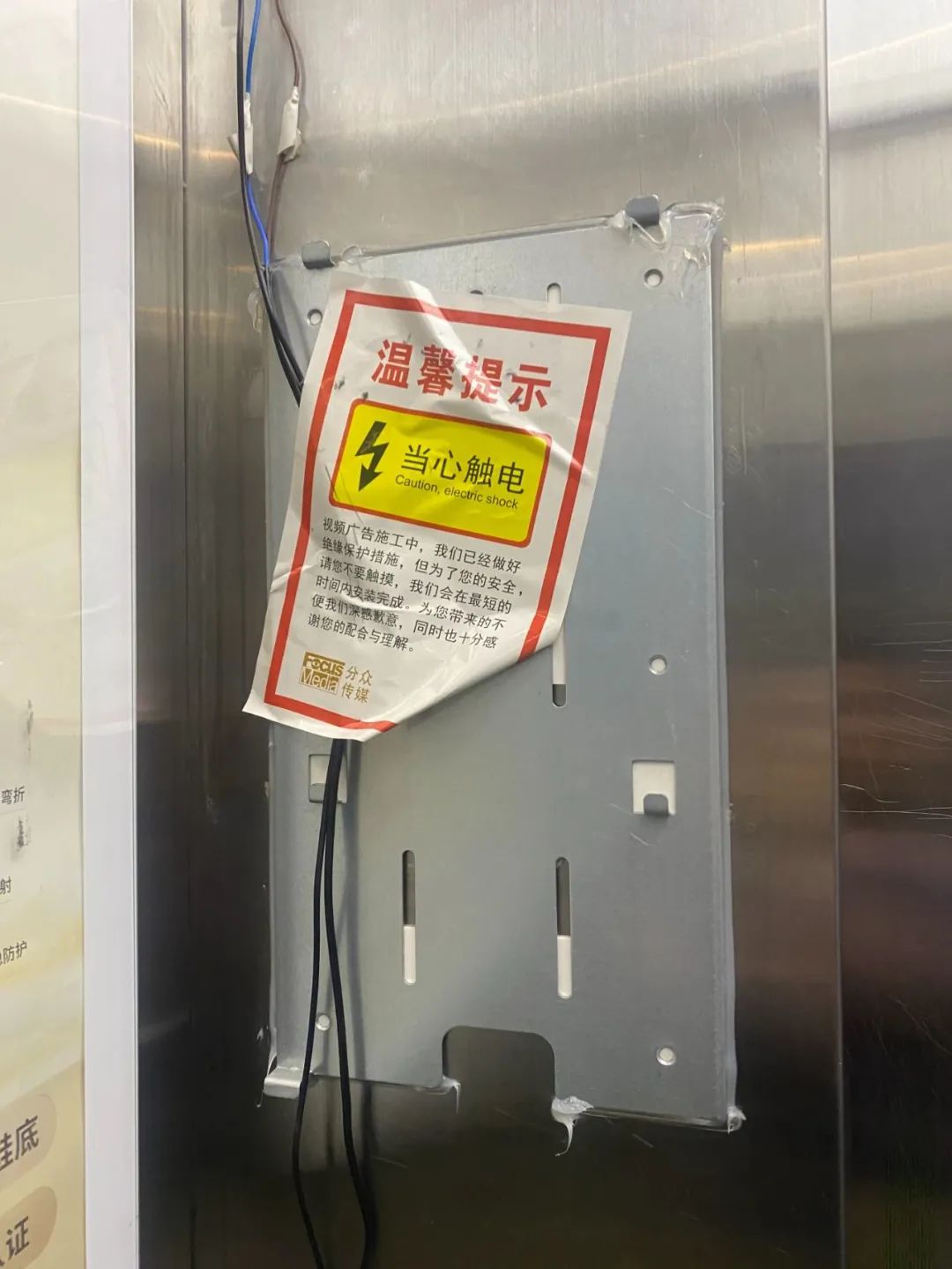 最近易女士发现,小区电梯内部也开始进行电子广告屏的安装,“前段时间我看到施工方已经在接电线了,而且还没有施工完毕,电线都裸露在外面,当时我年仅8岁的孩子差点触碰到,感觉很危险。”过了几天,易女士又发现施工方贴了一个“当心触电”的警示贴,“我们也跟物业投诉了,他们答应这周一来拆除,到现在都没有动静。”